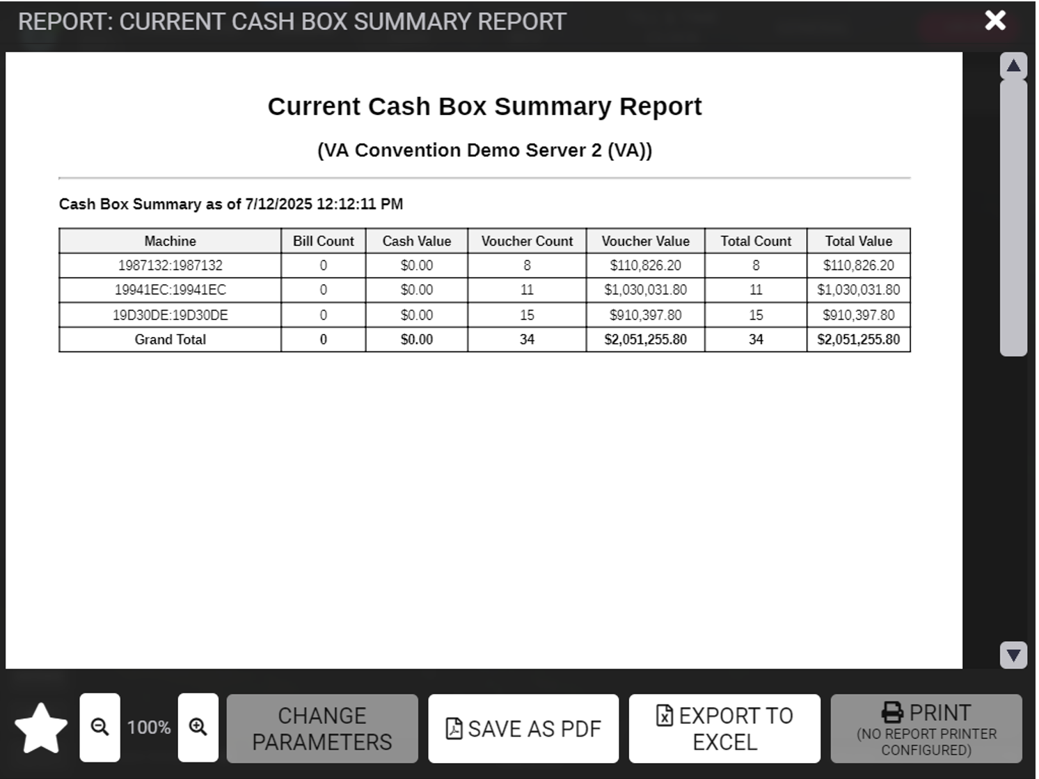 - The Current Cash Box Summary Report will show you how many and how much money and vouchers are in each of the EGMs. This is based on what has been inserted into the machine since the last time it was emptied out.