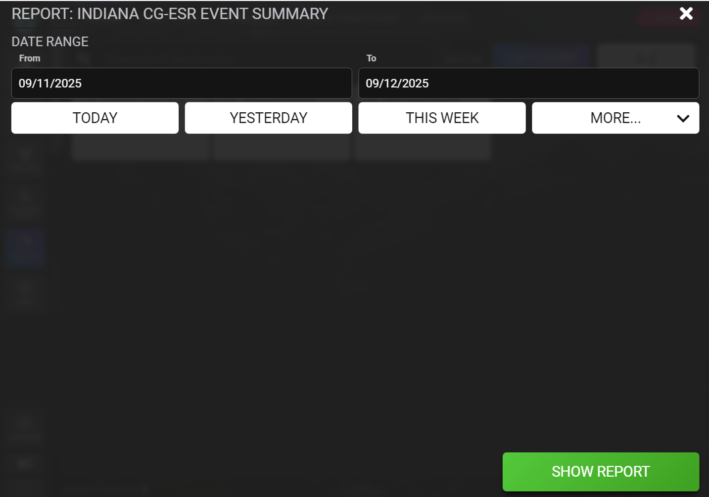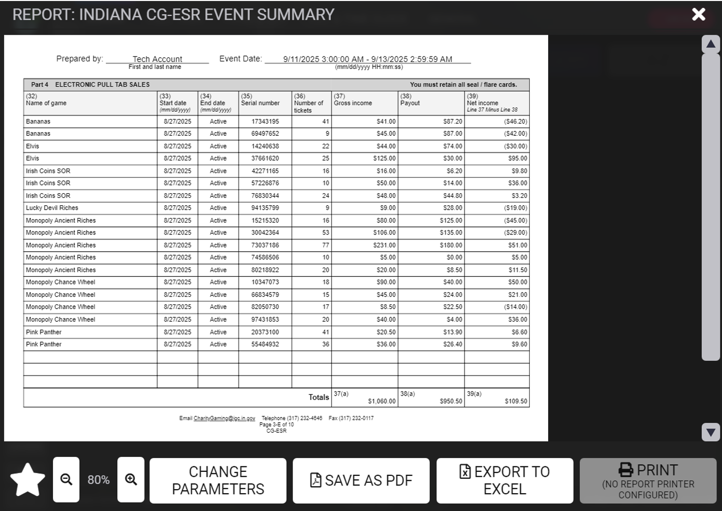 - The Indiana CG-ESR Event Summary will provide you with all the required information to fill out the E-Tabs section of the Indiana CG-ESR form. After each activity, organizations are required to complete an event summary report for that day's charity gaming activities. You can run this report for a single day as required for the CG-ESR form, you can select from one of the pre-defined date ranges, or you can enter in a customized date range.
