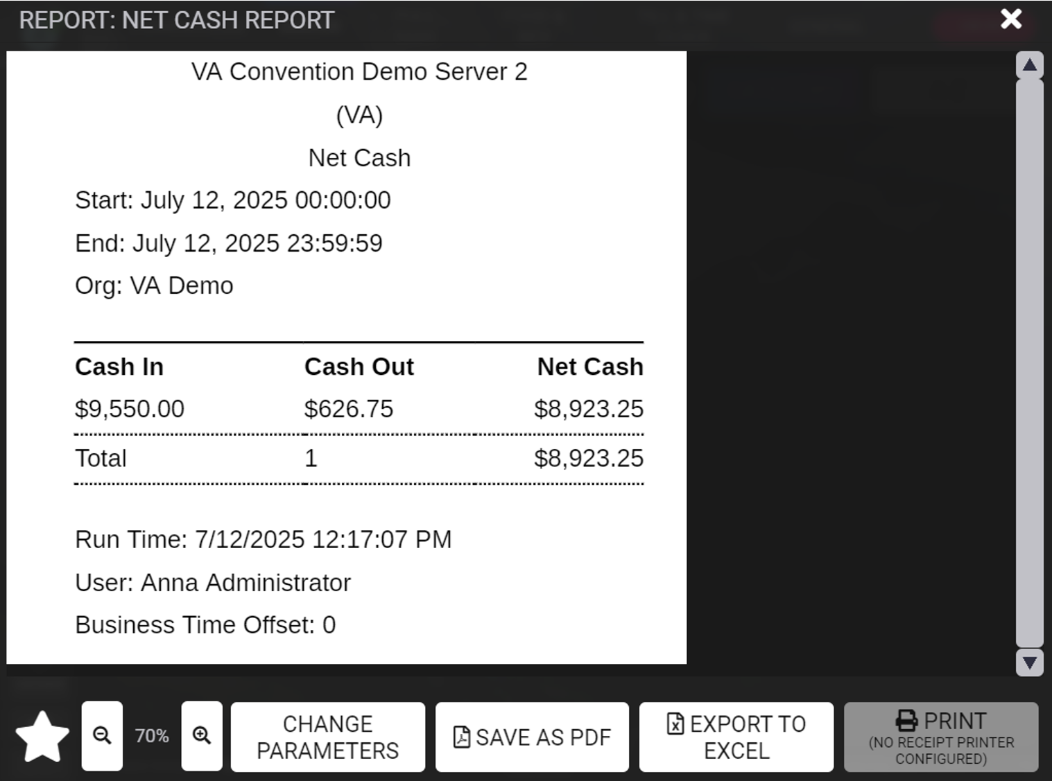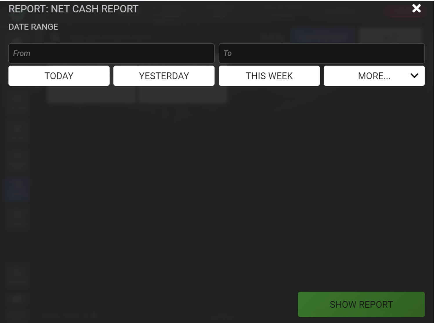 - The Net Cash Report will show you the total cash net for the given time period. When you select the report, it will prompt you for the date range that you want to run the report for. There are some pre-defined date ranges that you use by a single click of a button, or you can enter in a customized date range.