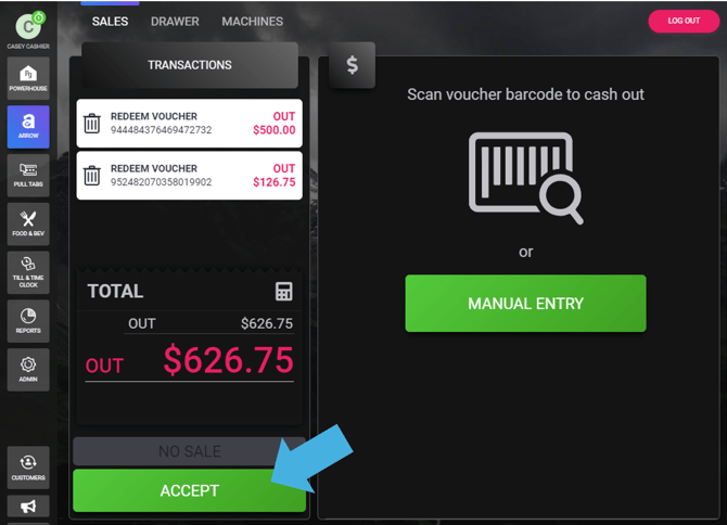 - The system allows you to scan multiple vouchers and redeem them all in a single transaction. Once you have scanned or manually entered all vouchers you wish to redeem and confirm the total amount is correct, press the ACCEPT.